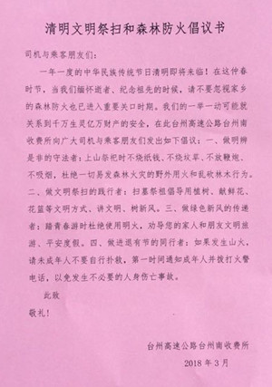 為增強防火意識,做到文明祭掃,3月16日上午臺州南收費所在向過往司乘人員發放《清明文明祭掃和森林防火倡議書》,倡議大家做明辨是非的守法者:不燒紙錢、不放鞭炮、杜絕野外用火和亂伐林木行為;做文明祭掃的踐行者:提倡用植樹、獻鮮花、花籃等方式祭祖;做綠色新風的傳遞者:勸導家人和朋友文明出游;做進退有節的同行者:發生山火,理智救火。