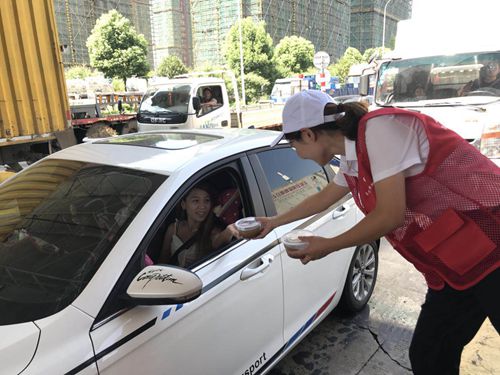 圖為志愿者給過往司機遞上清涼飲品