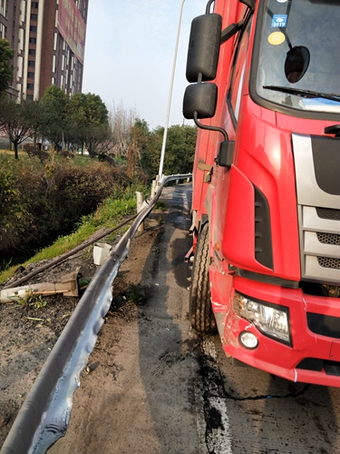 圖為貨車撞向護欄后的場景 據了解,該車從臨海北上高速,車內只有一名司機,在錯過服務區時頗感疲乏,想著路途不是很遠,堅持會就到臺州出口了,卻在下高速時放松了精神,一下就撞到了路邊的護欄上。7號車道是該所最側邊車道,幸虧當時車速較慢,撞在護欄后停了下來,否則后果不堪設想。司機在交費后還對受撞損的護欄進行了賠償。 在此,筆者提醒廣大司機朋友們,天氣漸暖,不管在何時何地開車,一定要避免疲勞駕駛,集中精力仔細觀察道路情況,確保行車安全。 馬德偵