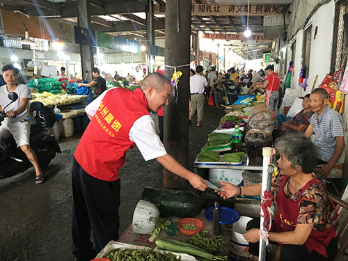 志愿者們特地選取菜市場、商鋪等人多且容易產(chǎn)生垃圾的地方,向店主和商販們宣講環(huán)境公害引發(fā)的負(fù)面后果及如何處理平時的生活垃圾,他們結(jié)合宣傳冊通俗、耐心地講解生活垃圾要從源頭開始分類投放:干濕要分開,對剩菜剩飯、瓜皮果殼等易腐垃圾要瀝干水分,投放后要蓋好垃圾桶,免得蚊蠅滋生;紙類、飲料瓶、金屬等有再生利用價值的要放在可回收的垃圾桶里;對電池、電子產(chǎn)品、殺蟲劑、油漆桶等含有害化學(xué)物質(zhì)的要單獨放;剩余的作其它垃圾處理。