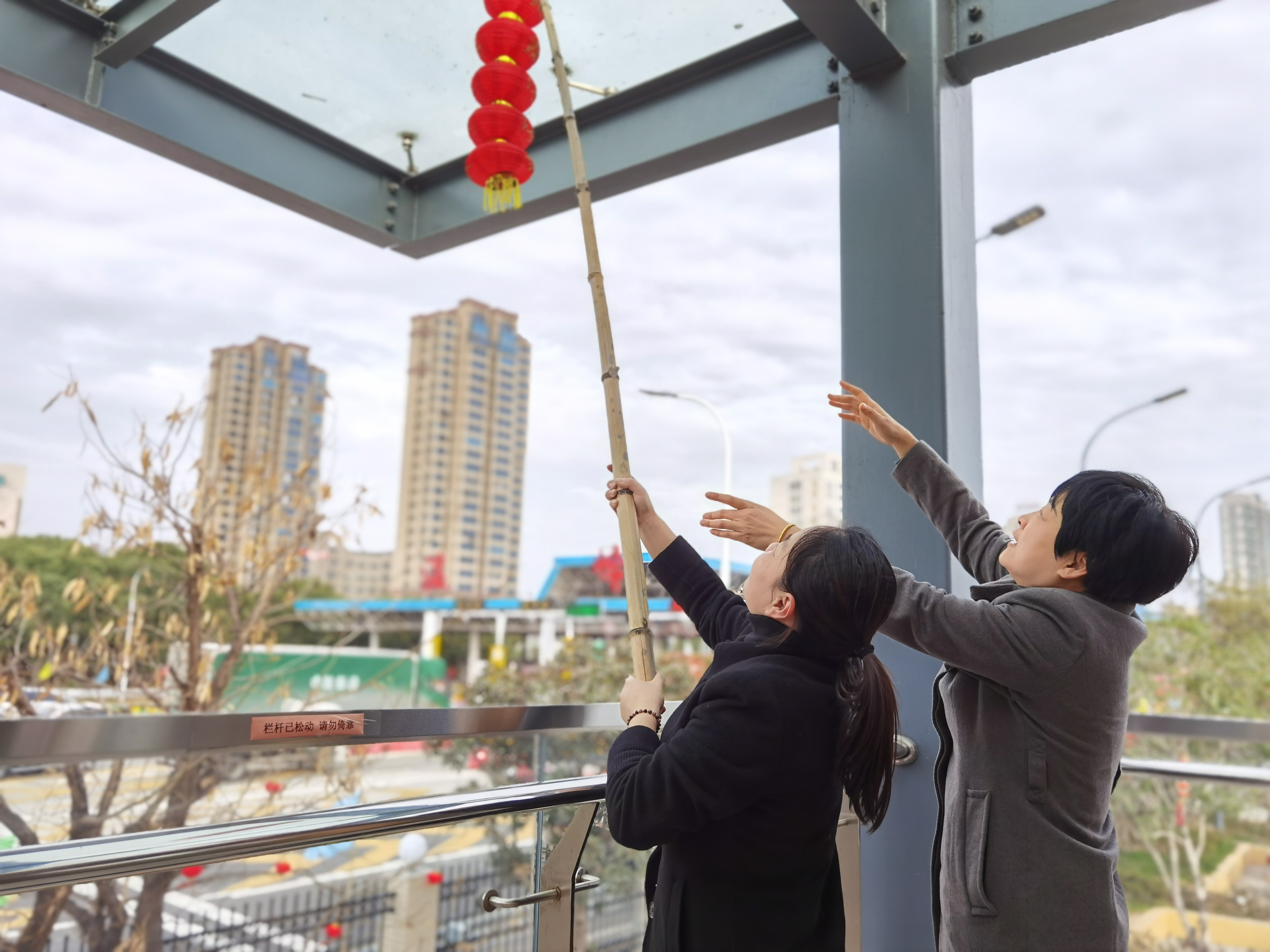 大家分工合作,搬梯子、遞春聯、貼膠帶、校正高低在站所內每個角落都掛上了紅彤彤的燈籠;收費區域內廣場兩邊的欄桿上扎著一面面彩旗。一幅幅精致喜慶的對聯、“福”字,一串串三角彩旗,一個個大紅燈籠把整個收費站所點綴得處處洋溢著濃厚的節日氛圍“年味”十足,讓在站員工和過往司乘朋友感受到新年的喜慶氛圍和“家”的溫暖