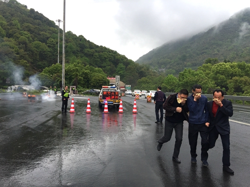 執勤隊緊急出動,趕赴事故現場。“哎呀,著火啦!”事故車上司乘人員呼喊著“快!快救火!快救人!”一組人員迅速擺放安全警示牌后,快速有序地將滯留群眾疏散到安全位置,另一組人員利用消防水槍滅火,控制事故車輛火情蔓延,值勤隊長根據現場判斷,果斷地通知中控員開啟隧道風機系統,對隧道內濃煙進行處理,隨后成功撲滅大火。