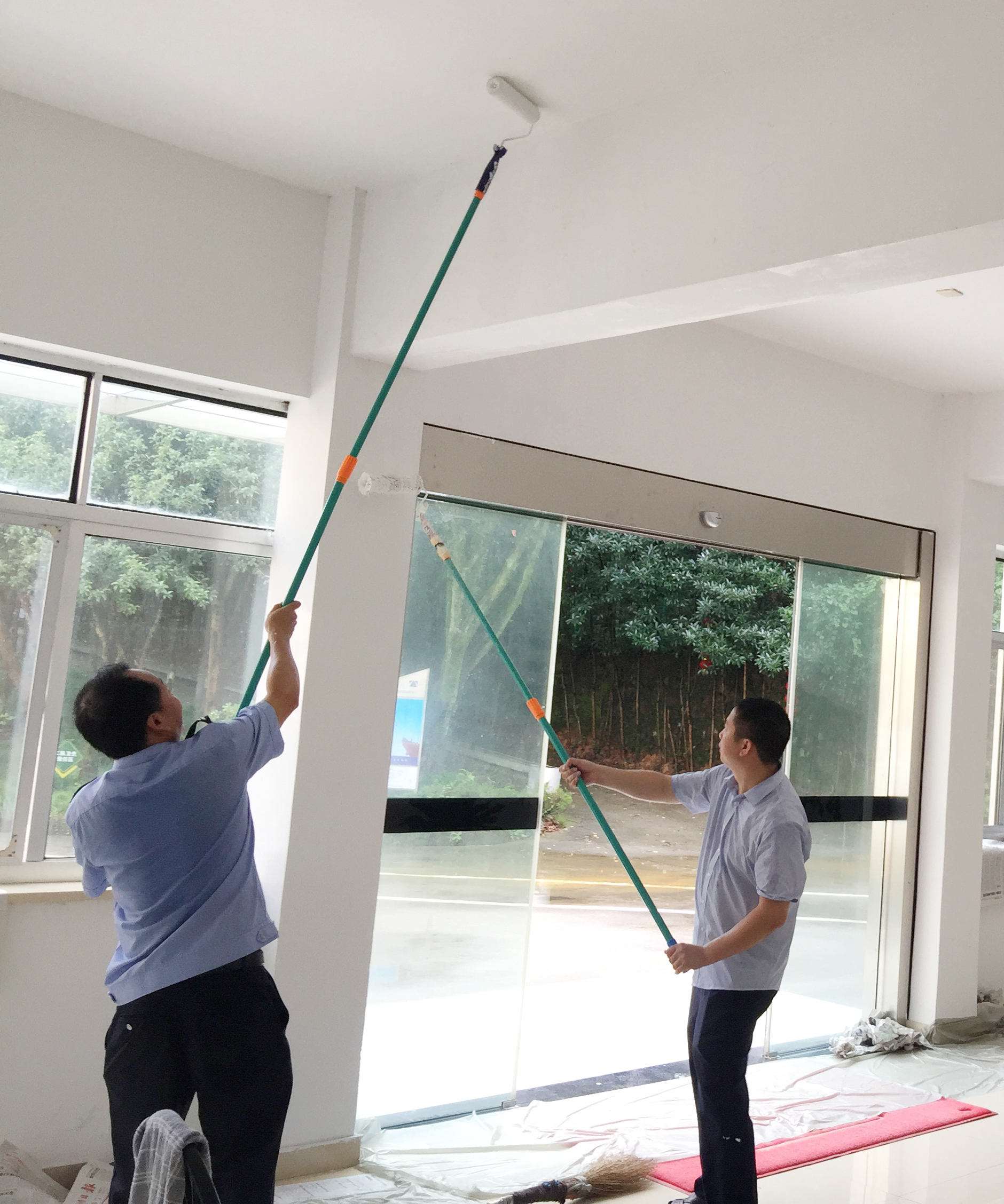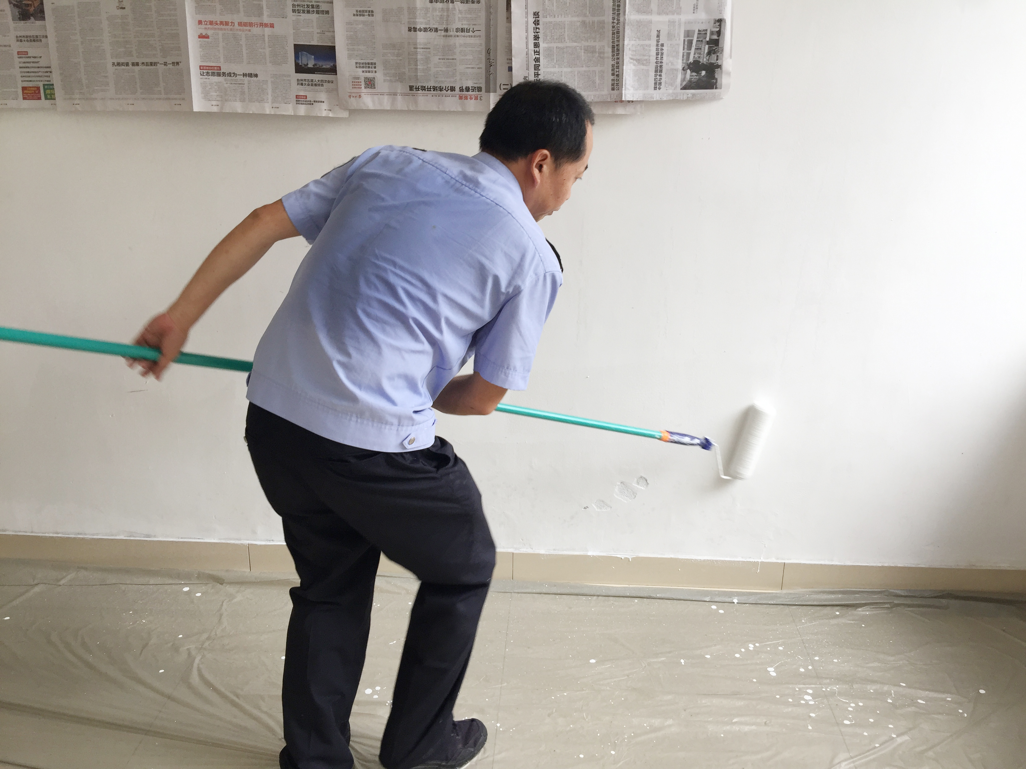 圖為“粉刷匠”粉刷現場 現場,工具備齊后,大家捋起袖子開始動工。家里正在裝修的林通,有著豐富的粉刷經驗,指導大家如何將墻體粉刷得平整又美觀。分工明確后,有的拿起粉刷棒,有的攪拌涂料,有的鋪墊報紙及塑料紙,有的清理刷墻后殘留在地面的垃圾。整個勞動過程中,各個動作麻利,干勁十足。粉刷是個技術活,更是個力氣活,只見浸滿涂料的刷子在墻上揮舞著,個個汗如雨下,卻都顧不得休息,在大家的齊心協力下,原本一片灰不溜湫的墻壁變得雪白光潔。 這次義務勞動,不僅美化了站所環境,營造出廉潔的工作氛圍,增強了員工的凝聚力和向心力,更增加了全體員工對公司的一份熱愛。 林玲