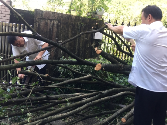 臺風(fēng)“利奇馬”肆虐而過,雖然黃土嶺隧道所提前做好各項防臺措施,但是干凈整潔的管理所在這場天災(zāi)中還是遭受到了破壞,樹木倒折、落葉、樹枝滿地,淤泥坑洼,現(xiàn)場一片狼藉。8月12日上午剛剛恢復(fù)正常供水的黃土嶺隧道所,全體人員立馬投入到重建家園中,打掃衛(wèi)生,原地種回倒伏的樹木,清理淤泥……徹底消除臺風(fēng)過后留下的殘敗痕跡。