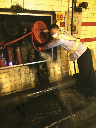 執勤隊員們有序分工,紛紛帶上工具,開始檢修消防設備、清洗隧道內攝像頭、維修陳舊的機電設備、拆換燈具等等,現場一派忙碌的景象。四公里長的隧道內有82個消防箱,每隔50米就有一個,而里面空氣質量很差,比霧霾嚴重數百倍,僅一只口罩根本凈化不了廢氣,但由于時間緊,任務重,隊員們顧不上惡劣的環境,努力和時間賽跑,爭取高效完成任務。