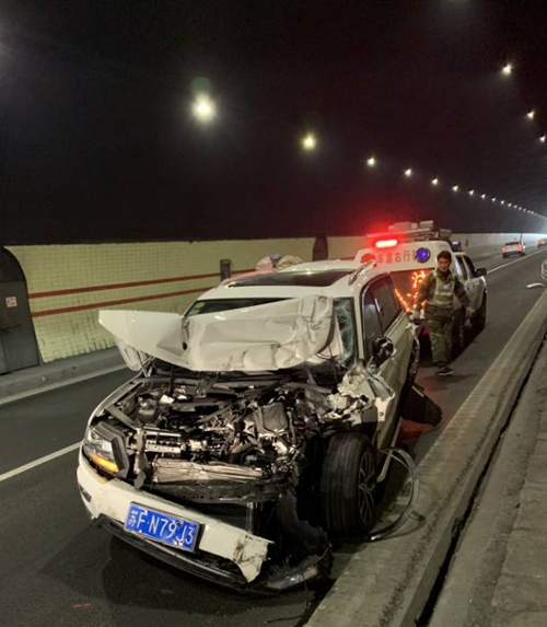 在很短的時間內,巡邏車趕到現場。此時塘嶺隧道事故現場一片混亂,車輛滯留執勤隊到達現場做好預警措施后,執勤隊員勸離兩輛事故車駛往塘嶺隧道廣場等候交警處理引導擁堵車輛有序。巡邏車尾隨事故車輛做好預警工作,緩慢駛向寧向隧道口然而當巡邏車行至寧向出口處,又有兩車發生追尾,被追尾車輛已是“體無完膚”,現場有大量的拋灑物,嚴重影響其他車輛通行,需拖車和清障車的救援,清障施救車輛也及時趕到,現場才恢復正常通車,此時距離第一起事故發生僅僅過去半個小時