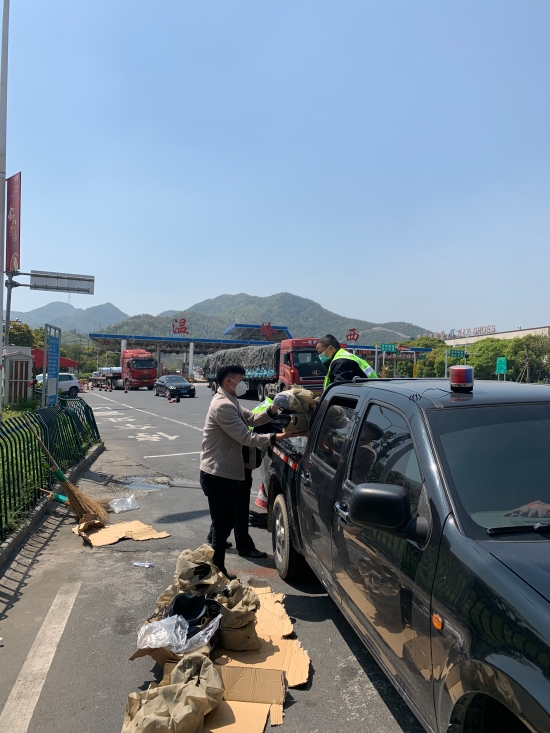 執(zhí)勤隊員們立即做好現(xiàn)場預(yù)警工作,擺好隔離錐,拿出掃帚快速清理。這時,肇事司機發(fā)現(xiàn)貨物丟,在溫嶺西收費站出口等待。隊員趕緊清完現(xiàn)場,載著貨物直奔溫嶺西收費站。