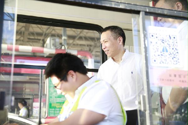 圖為集團(tuán)副董事長、總經(jīng)理張建平在溫嶺西收費(fèi)崗?fù)z查