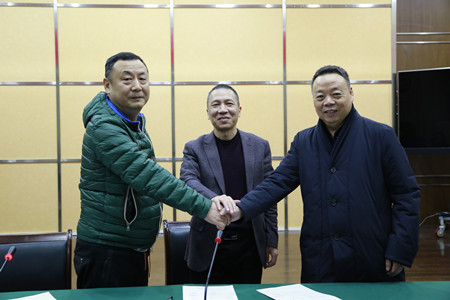 圖為集團副董事長、總經(jīng)理張建平與另外簽約代表握手