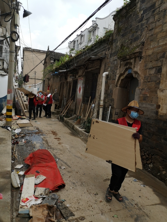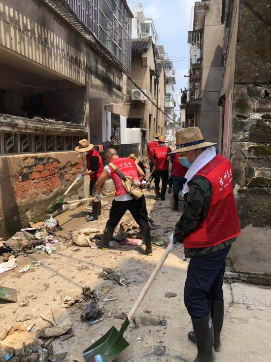 圖為臺州高速志愿者支援災區重建現場 在臨海古城赤城路米篩巷,臺州高速集團的志愿者們頂著毒辣的太陽,不怕臟不怕累,積極為災后重建貢獻力量,清理路面淤泥、垃圾,保障路面清潔以及道路順暢。 真情傳遞溫暖 愛心匯聚力量, 面對災后重建, 臺州高速集團用實際行動, 彰顯鐵軍精神, 承擔社會責任, 展現使命擔當。