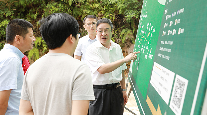 圖為陳文波一行在淡竹景區查看茅草山莊外立面建設情況
