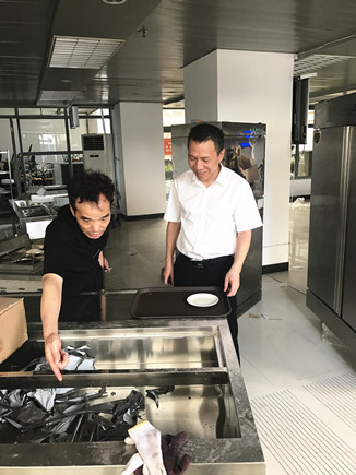 圖為公司副總經(jīng)理董阿林于7月1日到大樓檢查指導(dǎo)食堂整改情況