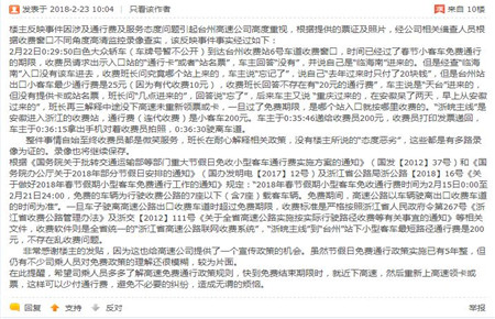 整個收費過程,未曾出現投訴人所說的亂收費和態度惡劣現象,黃智超始終以熱情的微笑面對司機,陳幸也是應對問詰,保持禮貌,堅持原則,不急不躁地做好收費政策解釋工作。 目前,該事件在集團各部門的合力下,已妥善處理完畢。對此失實消息,辦公室也及時予以了有力回復,在客觀澄清事情原委的基礎上,依法依規、有理有據地向社會公眾進一步宣傳收費政策,釋疑解惑。該貼在網絡論壇點率率已超過3千,網民評論都是一片倒地點贊支持高速集團的政策解釋。