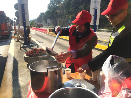 圖為工作人員在備熱飲品 當天是入冬以來最冷的一天,收費崗亭周圍氣溫達到零下4度。該所員工身穿耀眼的“紅馬甲”,面帶微笑,在車道安全島內搭起臨時“便民服務臺”,頂著嚴寒為過往司乘人員遞上一杯杯滾燙的姜茶與紅豆湯,并提醒司機朋友天冷注意保暖。 “姜茶暖我身、服務心貼心啊!”一位司機師傅接過姜茶不由地詩意起來。 “你們服務態度真好,有禮貌,充滿熱情,這么冷的天,能有一杯熱水是多么幸福的事情啊!”另一位司機朋友一臉笑意地稱贊道。 他們的友好回應讓員工們忘了寒冷,也給了大家提供更貼心服務的動力。