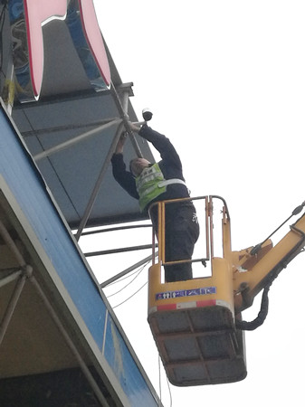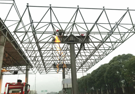 “起吊”,隨著現場施工管理人員的一聲令下,兩臺吊機吊著鋼結構網架緩緩升起?!巴笠稽c,慢一點”經過近十分鐘的努力,在施工現場管理人員的準確指揮下,吊機駕駛員輕輕地把鋼結構網架準確無誤地放在預定支架上,溫嶺西收費車道鋼結構網架成功完成吊裝。接下來施工人員陸續在網架上鋪設面板,安裝標志牌、照明、監控等設備,并對崗亭機電進行調試。