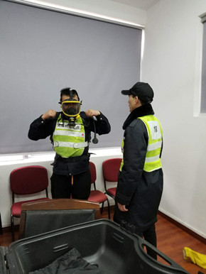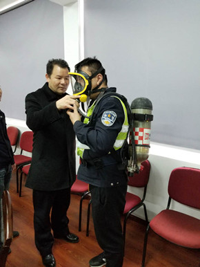 培訓中,陶文輝講解了“高速隧道火災特點”及呼吸器、防化服的使用方法相關要求。話題開啟后,隊員們紛紛參與討論,爭相發言,講述各自在隧道事故處理中施救和應對的經歷與心得交流平日巡查中所需注意事項,互相提醒工作中的不足,并針對實際問題提出了許多建設性意見。同時,在主講人的現場演示下,參訓人員逐個“以身試法”,進一步熟悉和掌握了防毒面罩的穿戴方法。