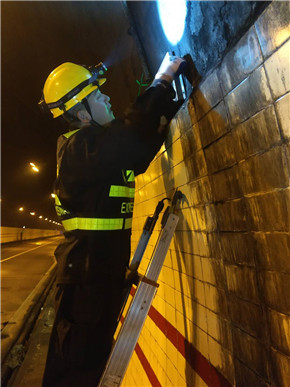 中心工作人員管理現(xiàn)場(chǎng)安全的同時(shí)主要負(fù)責(zé)修復(fù)隧道內(nèi)損壞的逃生標(biāo)志牌、報(bào)警電話指示燈、攝像頭等機(jī)電設(shè)備。