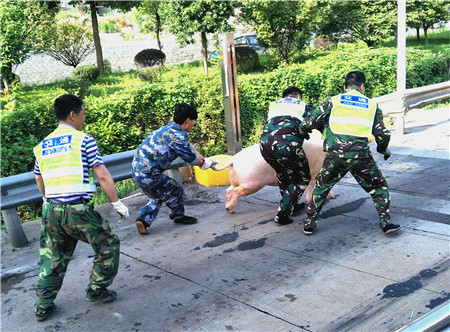 面對突發的緊急情況,駕駛員一時束手無策,當班副班長立即向值班領導匯報,請求增援。為了防止這頭豬給過往車輛造成安全通行威脅,收費所工作人員及時關閉了7號車道,此時的“二師兄”不讓人靠近,大家只好形成一個包圍圈,不讓它竄到其他車道去。幾分鐘后,增援的高速執勤隊員趕到現場,大家七手八腳,終于將這頭豬扛著,送回到了小貨車上。執勤隊員說,這輛車上的一頭豬剛剛還在黃土嶺隧道內跳出來一次。