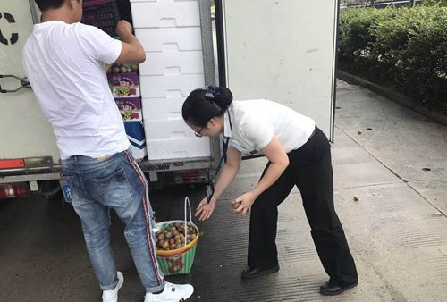 圖為工作人員幫司機(jī)撿李子