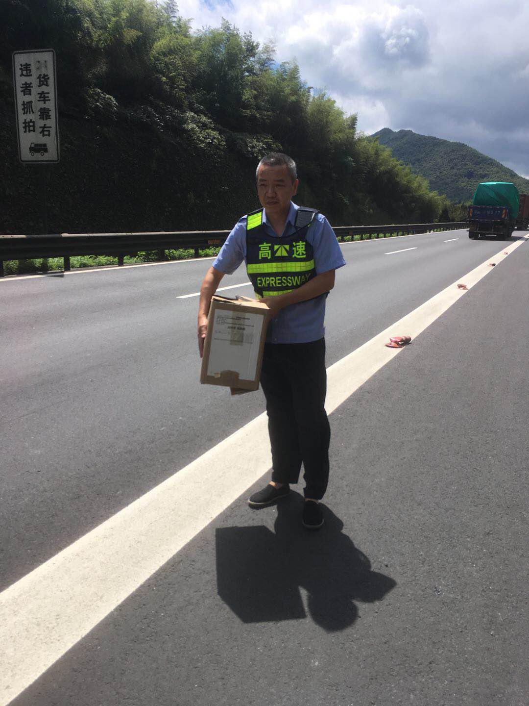圖為執(zhí)勤隊員搬走掉落在高速車道上的快件