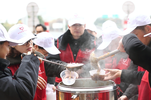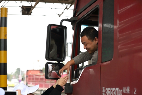 圖為志愿者合影 “師傅,喝一杯紅糖姜茶暖和一下吧。” “師傅,您這是貨車,這里有一份貨車非現金支付優惠的單子,請了解一下。”