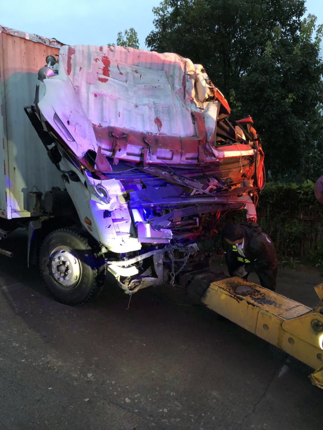 4點30分,快遞車成功拖離高速,人回到現場開始對半掛車進行救援。經過2個多小時的不斷調整、嘗試,盡管出動了兩輛吊車,但是半掛車的車頭死死地卡在樹里,吊車的力量無法撼動。“砍樹!”最原始的方法往往是最有效的方法。一群人馬上拿工具把卡住的部分砍斷。