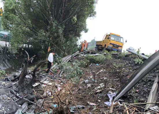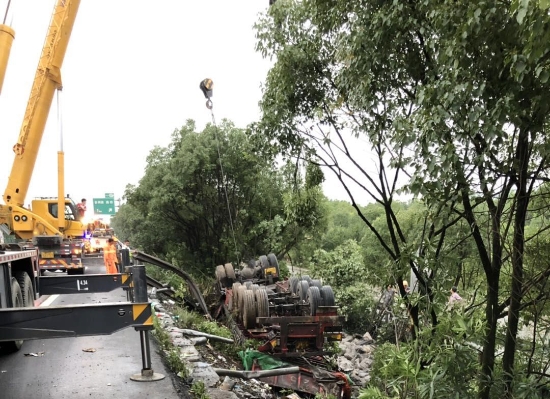 7月15日上午,臺州高速集團施救中心輔查員和駕駛員在核對路產損失。這是他們第三次到事故現場進行路產勘查。