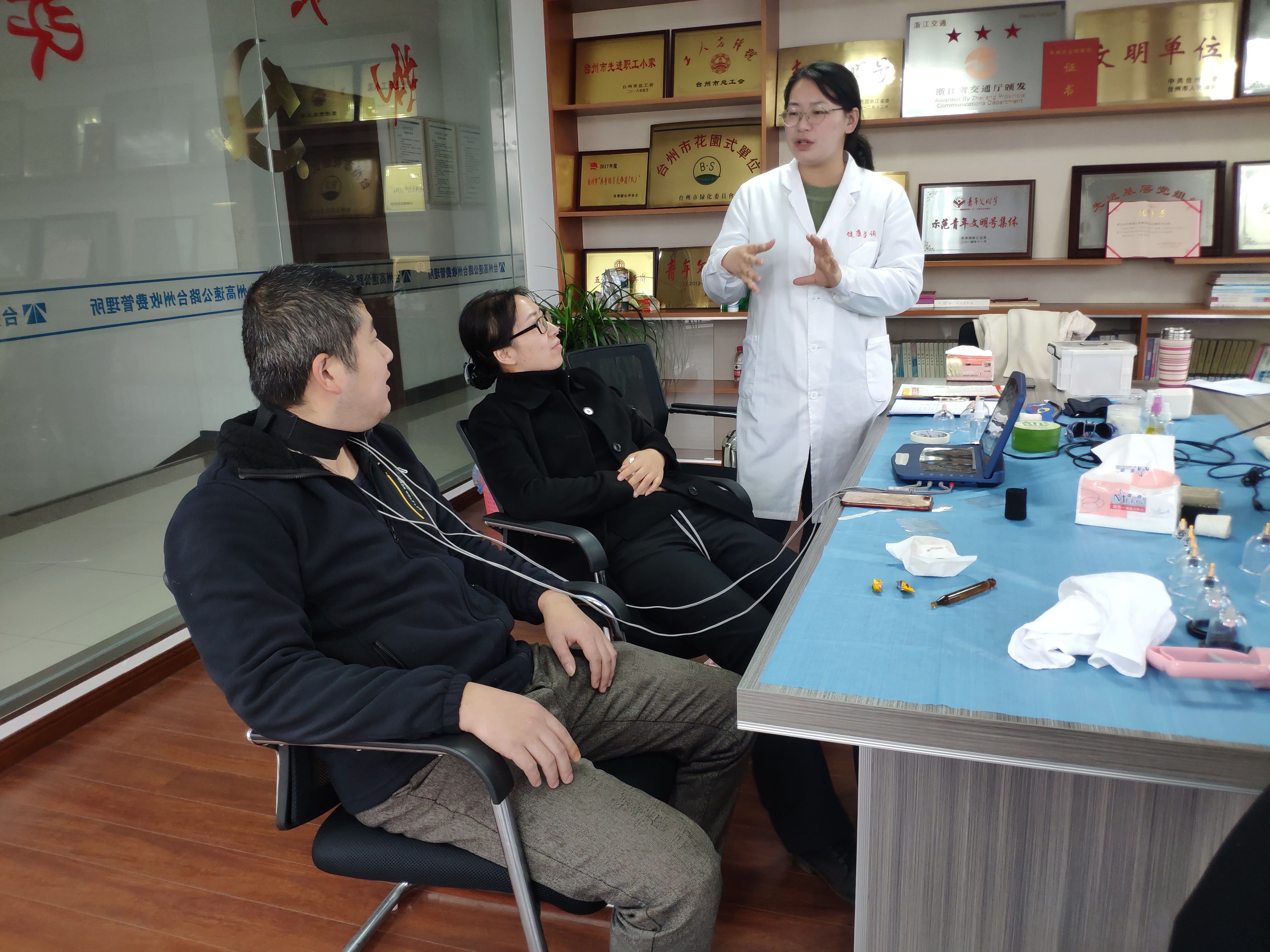 中醫(yī)理療走進身邊 12月23上午,來自上海中醫(yī)大科創(chuàng)基地健康咨詢師萬老師走進臺州收費所,為所里帶來中醫(yī)理療健康咨詢。本次活動包含血壓、頸椎、腰椎調(diào)理、脾胃虛寒等與我們身體生活息息相關(guān)的養(yǎng)生咨詢。