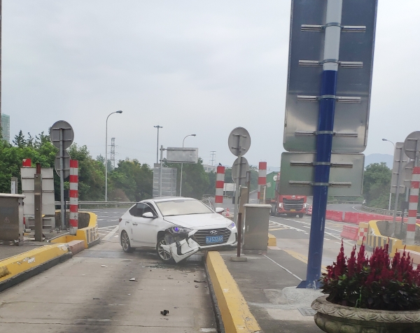 9月8日上午7點(diǎn)30分,一輛白色現(xiàn)代轎車在臺(tái)州收費(fèi)所出口準(zhǔn)備進(jìn)入ETC車道時(shí),突然撞向車道右側(cè)的全安島,在與安全島發(fā)生碰撞后,又一頭撞向了左側(cè)的安全島。 碰撞后的轎車半邊車身掛在了安全島上,車道上的光幕也因撞擊受損。收費(fèi)班長(zhǎng)在聽到一聲巨響后,第一時(shí)間跑上前去查看情況。因?yàn)閯×业淖矒?/span>,轎車的右側(cè)已經(jīng)在地上灑落一堆碎片。坐在副駕駛的女士從車上下來(lái)查看車況,隨后男司機(jī)也從另一邊打開車門下來(lái)。所幸撞擊并未造成人員受傷。班長(zhǎng)在確認(rèn)司機(jī)及乘客均無(wú)受傷后,一邊將事故報(bào)告監(jiān)控中心讓施救車輛前來(lái)救援,一邊提醒司機(jī)報(bào)警,人員站到安全島上方,不要隨意在車道上走動(dòng)。然后迅速跑到車道入口將水碼擋在車道口以防止有其他車輛誤入發(fā)生二次事故。
