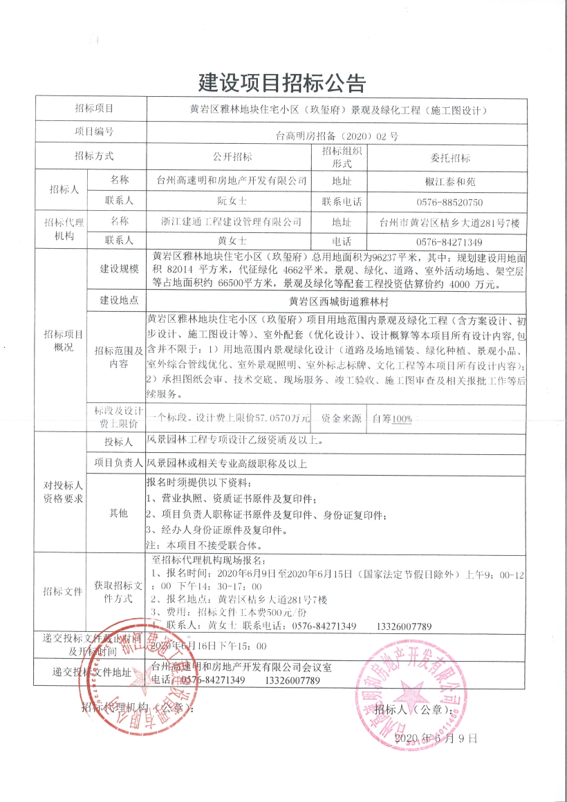 黃巖區(qū)雅林地塊住宅小區(qū)(玖璽府)景觀及綠化工程(施工圖設計)招標公告