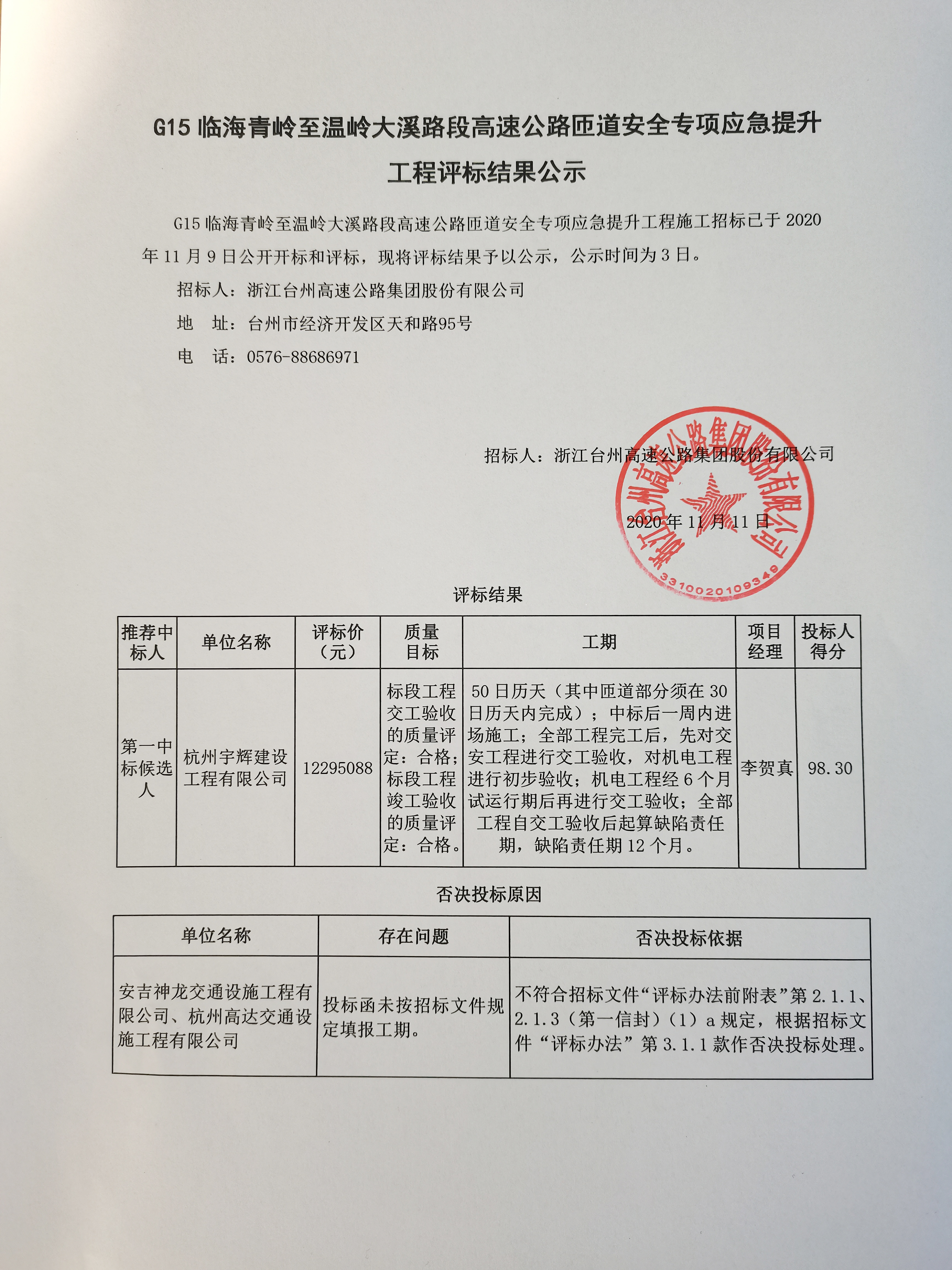 G15臨海青嶺至溫嶺大溪路段高速公路匝道安全專項應(yīng)急提升工程評標結(jié)果公示