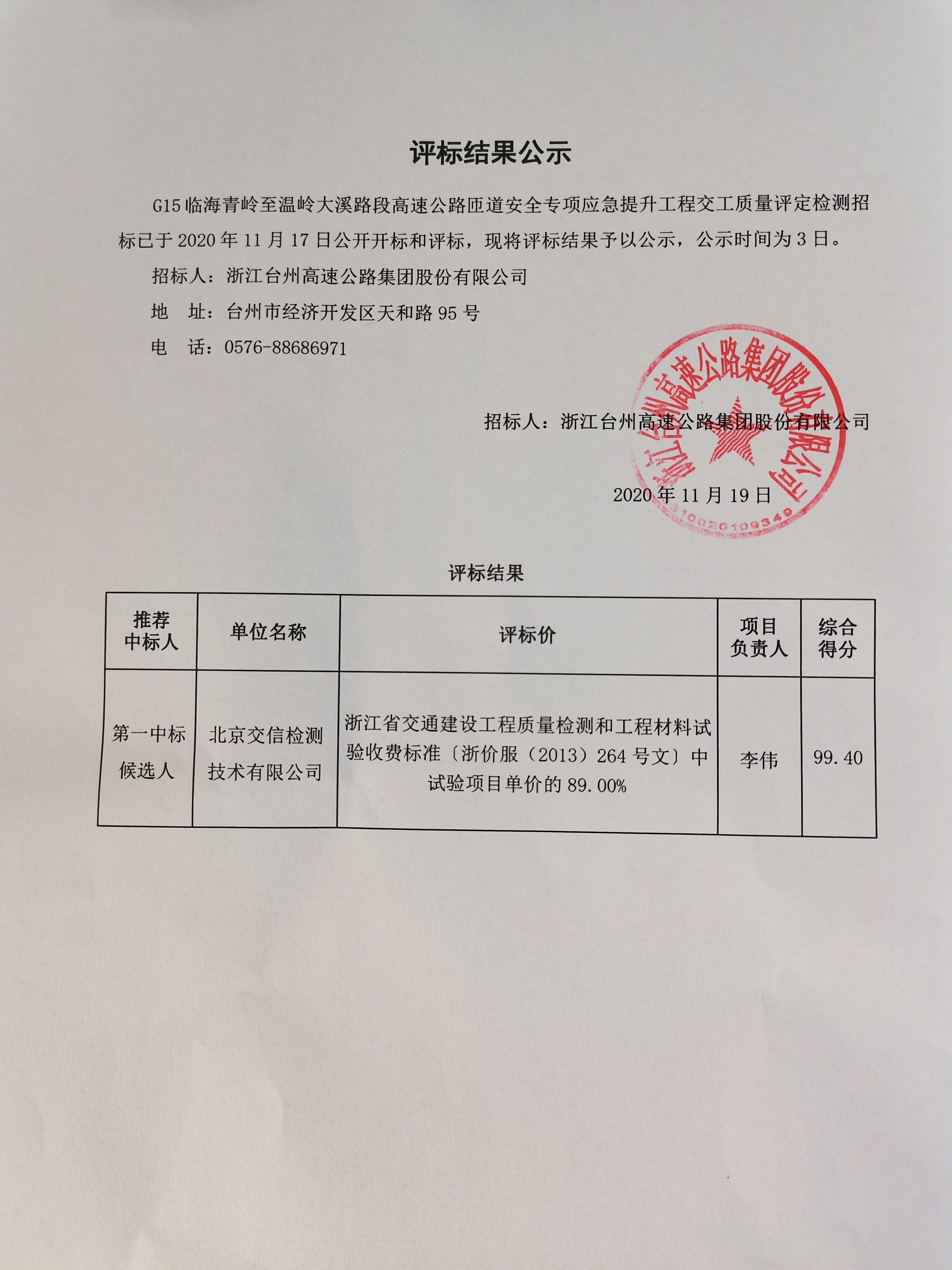 G15臨海青嶺至溫嶺大溪路段高速公路匝道安全專項(xiàng)應(yīng)急提升工程交工質(zhì)量評定檢測招標(biāo)評標(biāo)結(jié)果公示
