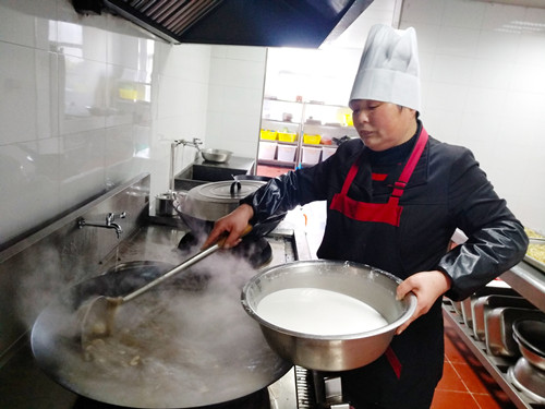 浸了一夜的早米,用石磨磨成米漿,細(xì)膩而幼滑,被靜置在盆里。“一般都用米粉泡水,口感粗糙,而且吃起來(lái)沒(méi)有香頭。”利花一邊說(shuō),一邊將香腸切碎與豆腐、冬筍、胡蘿卜、芹菜、香菇、蠶豆瓣翻炒著。旁邊的大鍋里,長(zhǎng)長(zhǎng)的豆面在骨頭湯里翻滾著,像一棵棵舞蹈的海草。徐徐倒入的米漿,被不停地?cái)嚢瑁耙钦车藉仯蜁?huì)有焦糊味,這鍋羹就算廢了。”米漿好像不夠,利花有些懊惱,“要是在家里,米漿都會(huì)多準(zhǔn)備一些,不夠就隨手添,我?guī)У竭@里就這些,也沒(méi)得加了。”就叫在一邊做幫手的妹妹寶花用面粉和山粉(也就是番薯粉)摻水拌起來(lái),倒入鍋里,湯漸漸濃稠起來(lái),倒入之前炒好的配料,加上切得細(xì)細(xì)的綠綠的芥菜梗、芥菜葉、海蠣,鍋里不時(shí)冒起大泡,香氣四溢。 為照顧吃不慣糟羹的同事,食堂還準(zhǔn)備了一鍋甜的山粉糊。來(lái)自臺(tái)州各縣市區(qū)的同事,按各自飲食習(xí)慣選擇了咸的或甜的。有說(shuō)芹菜的味道蓋過(guò)了芥菜清香的,有說(shuō)沒(méi)有加入芋頭口感不夠糊的,但撲鼻的香氣和濃厚豐富的口感立刻讓人忘了挑剔。對(duì)我來(lái)說(shuō),碧綠的芥菜葉和白胖的海蠣肉是整碗羹的顏值擔(dān)當(dāng)和靈魂所在。 每個(gè)元宵節(jié),對(duì)于在崗的同事們是沒(méi)有花燈可看、沒(méi)有燈謎可猜的,也不能與家人聚在一起吃羹。車道上此刻正是流量高峰期,大家匆匆吃完,都要趕著上崗。食堂大姐把多出的糟羹和山粉糊放進(jìn)蒸飯鍋保溫,叮囑大家下班后再來(lái)吃點(diǎn),這個(gè)吃了不扛餓。此時(shí),除了食物最能體現(xiàn)節(jié)日氣氛外,還有那一份特意為你留著的溫?zé)岣屓烁袆?dòng)。 鄭瑛芝