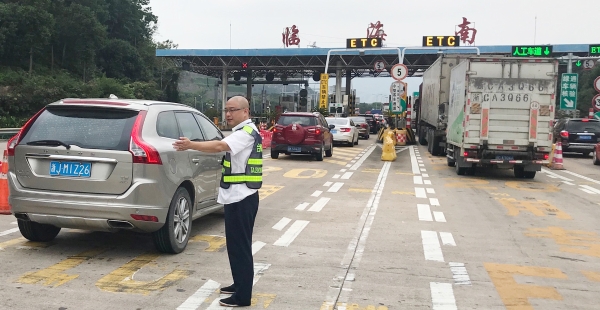 節日期間,車流量比往日多很多,每天多次出現長時間大分流,一遇上高峰期車輛源源不斷地從各個方向匯聚在此,容易造成內外廣場堵車。臨海南收費所車輛雖多,但該站所出口秩序井然,未出現擁堵現象。瞧!這位在車流中,身著反光背心在這場大車流中,揮舞著雙臂指揮著交通,讓飛馳的車輛通過客貨分離,有效降低客貨車隨意串道,達到快速放行的四班班長楊俊輝。
