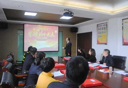 圖為學習十九大報告內容現場 黨支部書記王小勇制作了學習十九大報告內容的PPT,設框架、劃重點,以圖文并茂的形式,將學習十九大精神與日常工作緊密聯系起來,為更好地開展工作打下堅實的思想基礎。